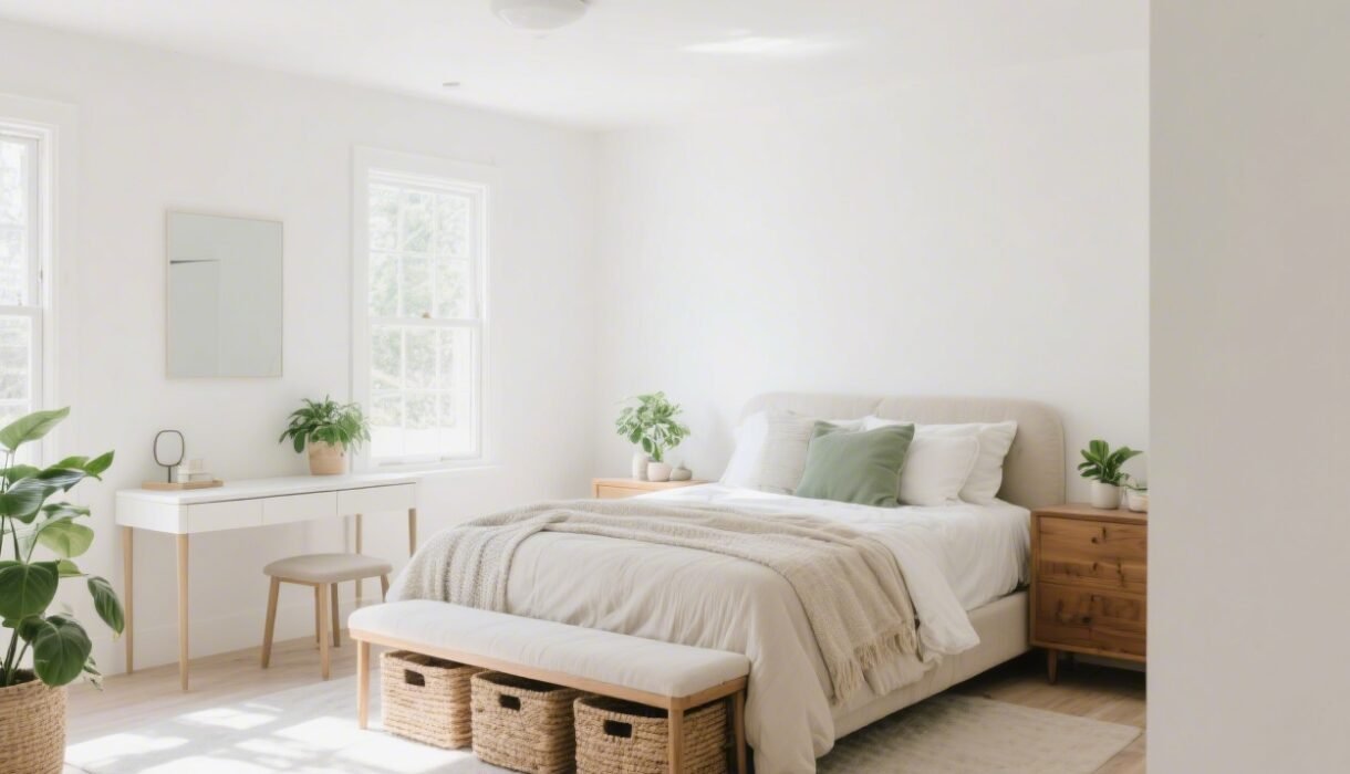 - Clear key surfaces: Nightstand, dresser, desk. Style them with 3-5 intentional items max.