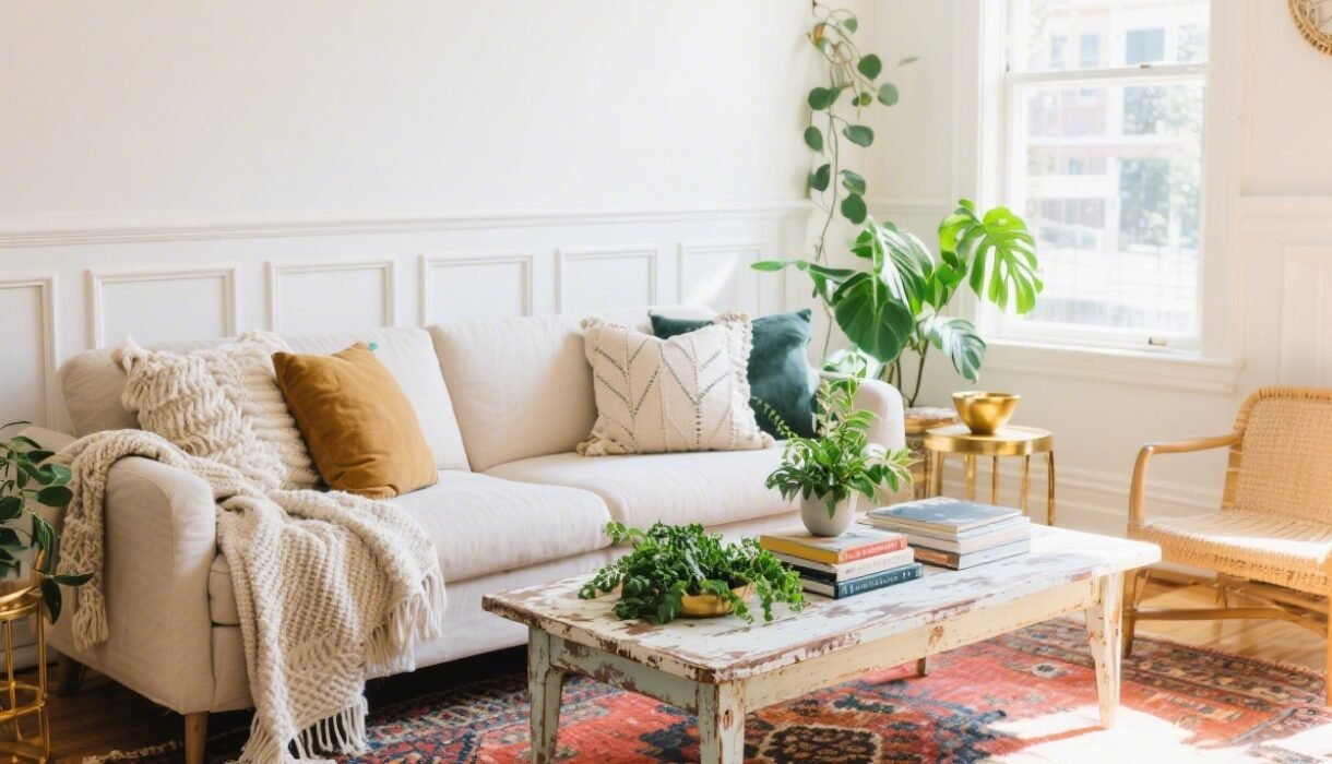 - Throws and pillows: Mix linen, velvet, and chunky knit. Stick to 2–3 colors.